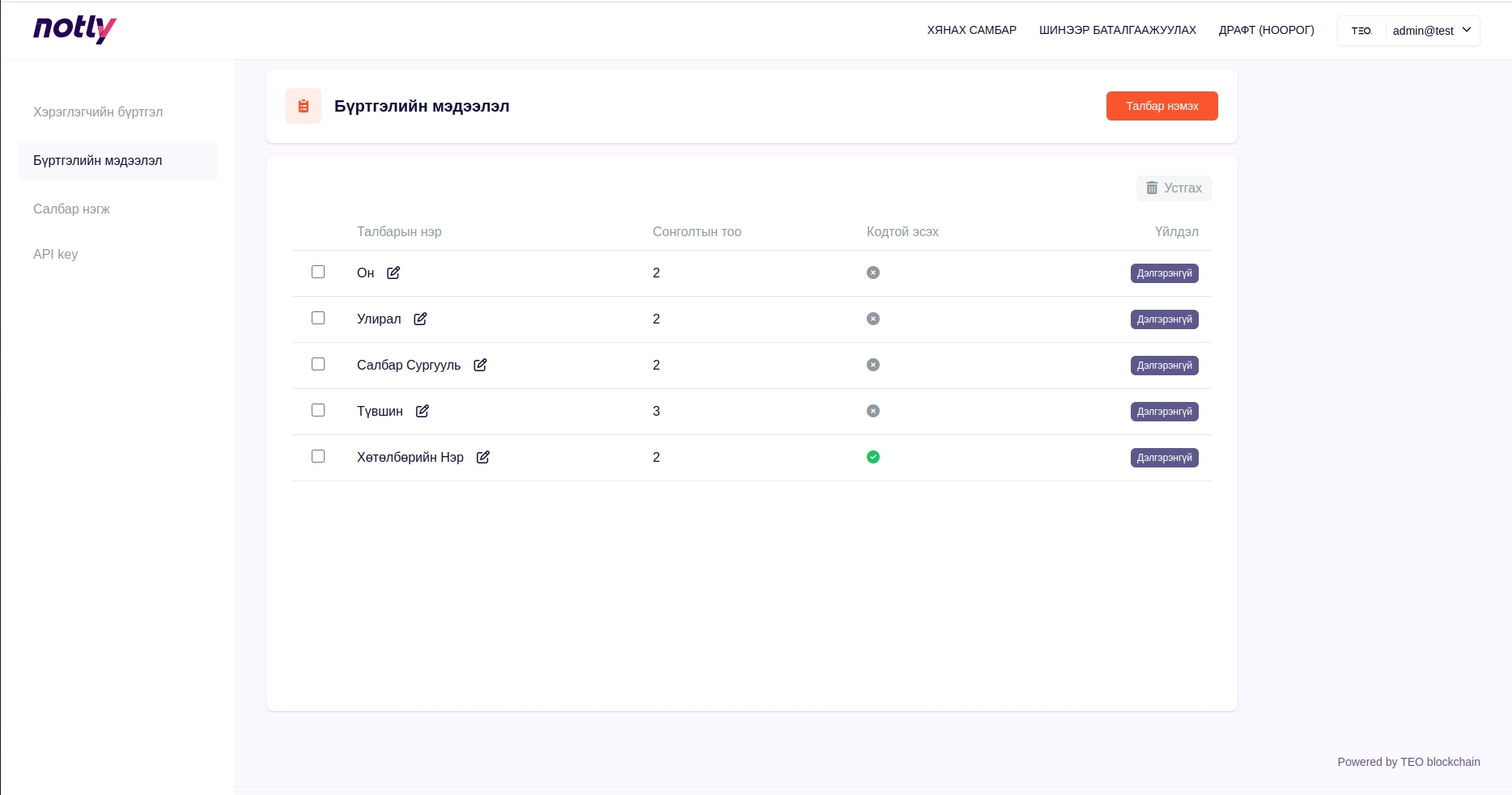 Хавтсыг үүсгэхээс өмнө та certify.mn ий админ эрхээрээ нэвтэрч Тохиргоо -> Бүртгэлийн мэдээлэл цэсийг сонгон хавтас үүсгэх дүрмээ тохируулах ёстой. Дүрэм нь дотроо нэг хавтас ямар ямар талбараас бүрдэх эдгээр талбаруудын сонгож болох утгуудыг оруулах юм.