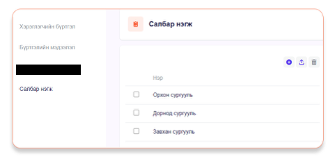 Хэрэв танай байгууллага салбар нэгжтэй ба уг салбар нэгж тус бүр зөвхөн өөрийн оруулсан цахим баримтыг л харах, удирдах шаардлагатай бол Салбар нэгж цэс дээр даран салбар нэгжүүдээ бүртгэж болно.