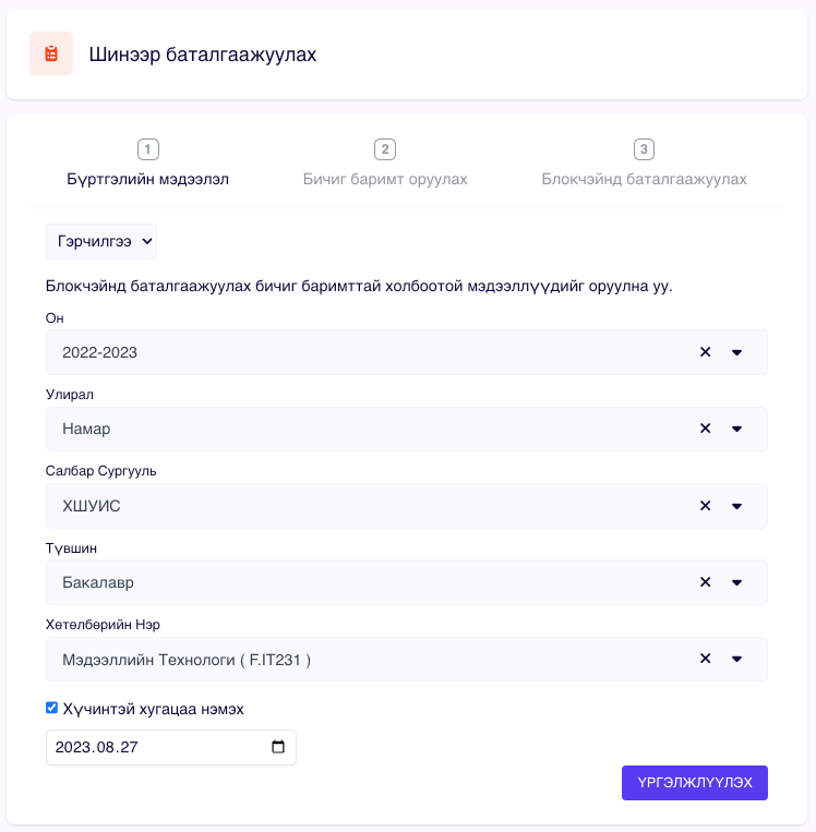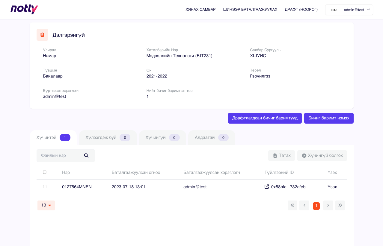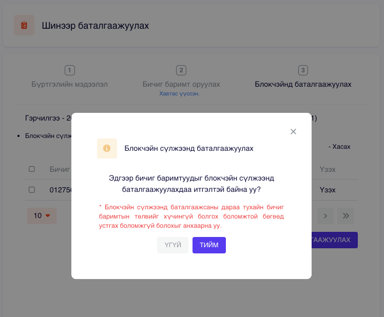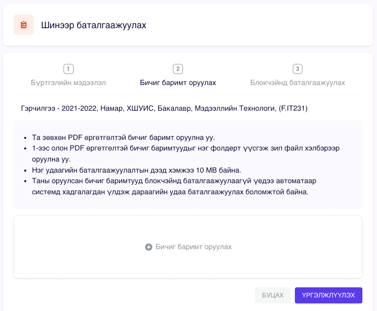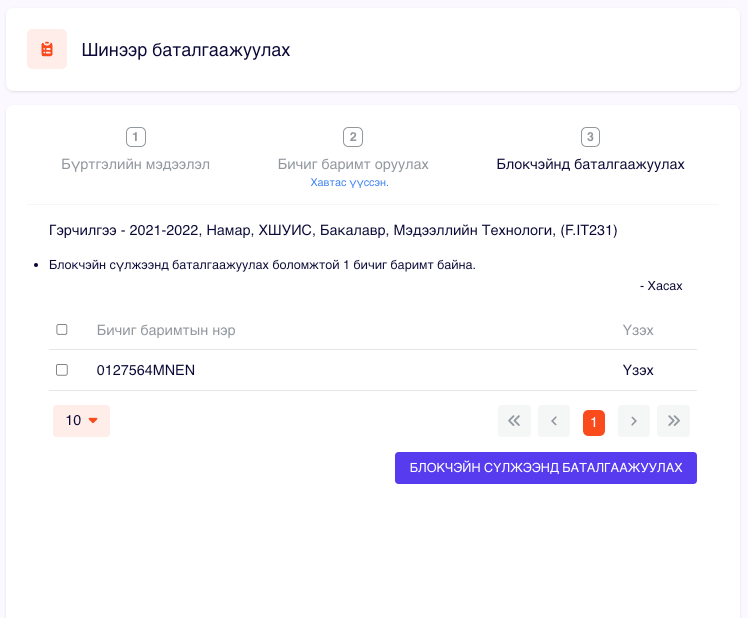 Блокчэйнд оруулах боломжтой файлуудыг жагсаан харуулах ба та мэдээллээ сайтар нягталсны дараа "БЛОКЧЭЙН СҮЛЖЭЭНД БАТАЛГААЖУУЛАХ" товчийг дарснаар файлуудын Hash утгыг блокчэйнд бичнэ.