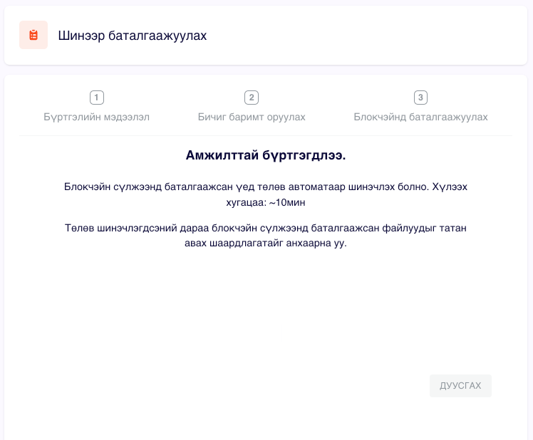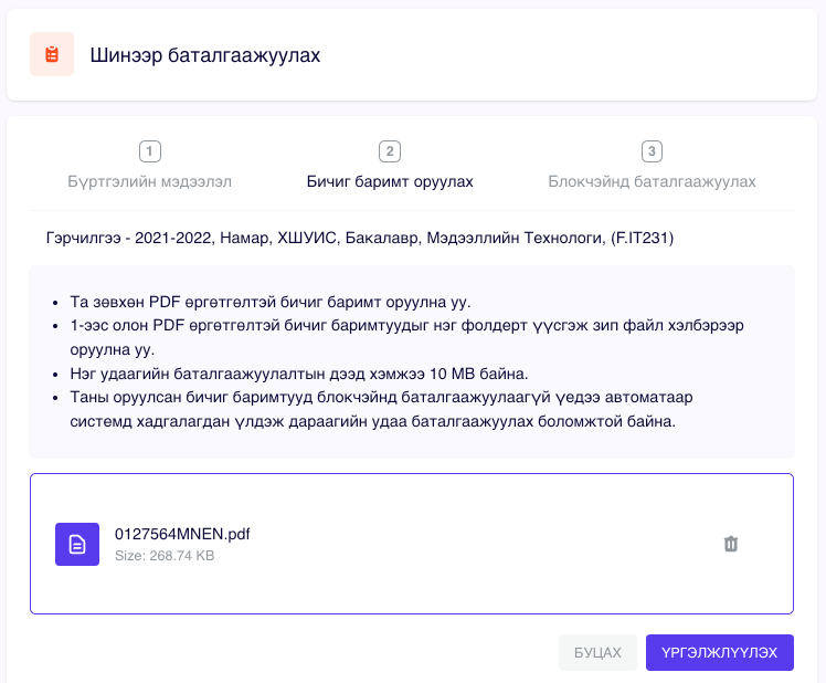 Файл сонгосны дараа дараах хэлбэртэй харагдах ба үргэлжлүүлэх товч дарснаар Блокчэйн сүлжээнд уг файлын Hash утгыг бичих алхам руу шилжинэ.
