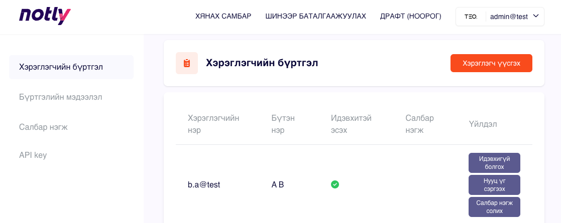 Нэвтэрч орсны дараа өөрийн профайл хэсэгт даран тохиргоо цэсийг сонгоно. Зүүн талын цэсэнд Хэрэглэгчийн бүртгэл, Бүртгэлийн мэдээлэл, Салбар нэгж, Api key гэсэн тохиргооны цэсүүд харагдана.