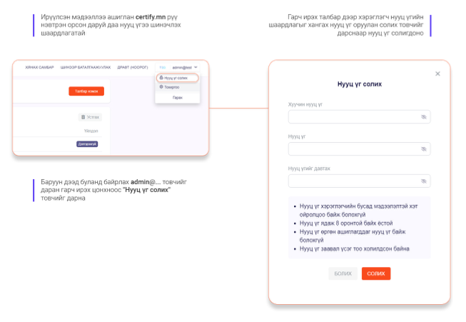 Бүртгэлийг баталгаажуулсны дараа системд нэвтрэх нэг удаагийн нууц үгийг илгээх ба эхний удаа нэвтэрч ормогцоо нууц үгээ солих шаардлагатай.