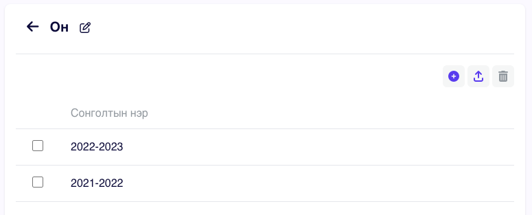 Мөн уг шинжүүдийн утга нь сонголттой байж болох ба та мөн сонголтын утгуудыг оруулж өгч болно. Жишээлбэл дээрх зурагт үзүүлснээр Он, Улирал, Салбар сургууль, Зэрэг гэсэн 4 мэдээллийг админ үүсгэсэн байна. Харин Он гэдэг мэдээлэлд гарч ирэх сонголтуудыг доорх зурагт үзүүлсэн шиг бүртгэж болно.