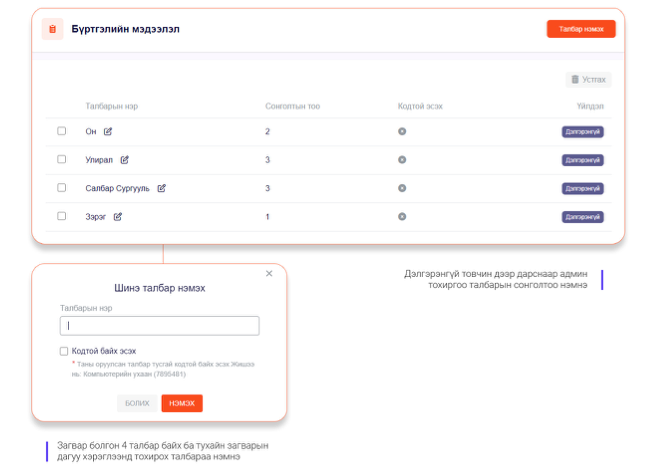 Сонголтыг шинээр бүртгэхдээ баруун дээр байгаа нэмэх тэмдэг дээр дарж дараах цонх гарч ирэх ба сонголтын утгыг бичин хадгална.