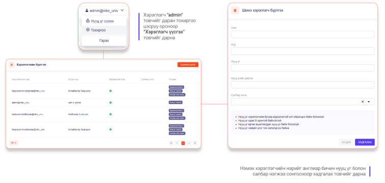 Хэрэв танай байгууллага цахим баримт үүсгэх олон ажилтантай бол админ хэрэглэгч нь Тохиргоо цэс рүү орон өөр хэрэглэгч бүртгэж болно.