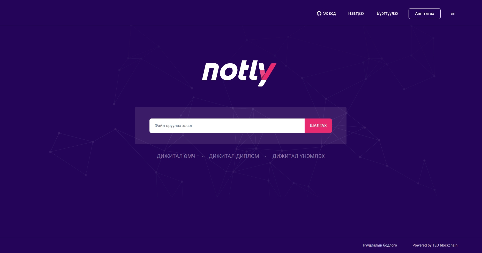 Цахим баримтыг блокчэйн дээр баталгаажсан эсэхийг notly.mn вэб хуудас ашиглан шалгахдаа та notly.mn-ий нүүр хуудаст байх "Файл оруулах хэсэг"-т дарж цахим файлаа сонгох эсвэл үйлдлийн системийн файлын цэснээс чирж оруулж шалгаж болно.